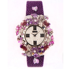 Hodinky Merveilleuse ruční výroby nezapřou francouzskou eleganci. Ozdobná luneta využívá kubické zirkony, glazuru, syntetický tyrkys a citrín. V elegantním pouzdře hodinek se ukrývá švýcarský strojek. Řemínek z kůže rejnoka v barvě temně fialové dodává tomuto šperku naprosto výjimečný vzhled. |